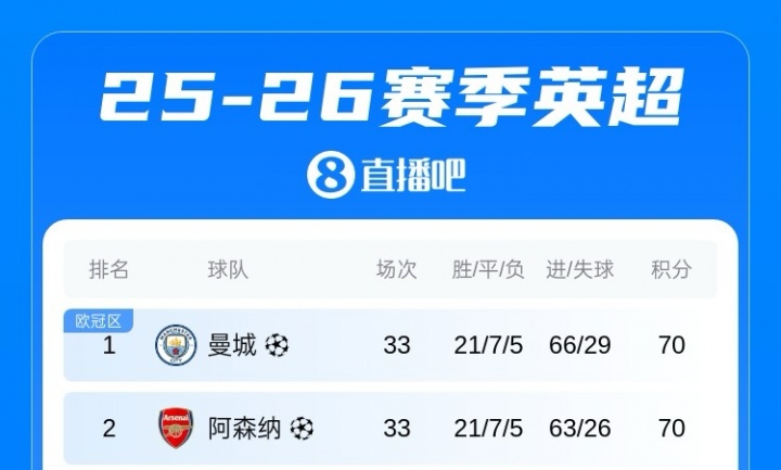 本赛季英超至今,曼城与阿森纳同场次、同积分、同净胜球,都是完赛33场、21胜7平5负积70分、37个净胜球。两队仅进球数和丢球数不同,曼城进66球、丢29球,阿森纳进63球、丢26球。